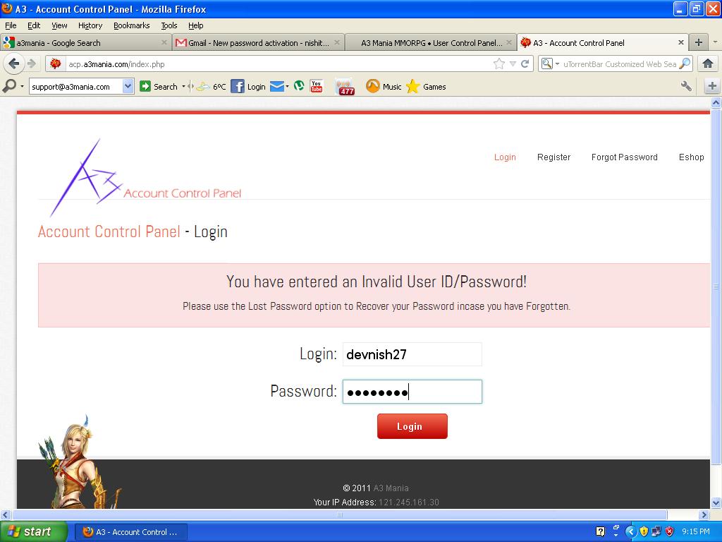 You are trying to login to A3 Mania Account Control Panel with A3 India account. That is why it doesn't work.