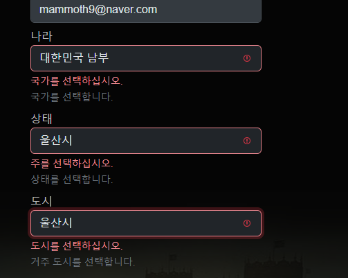인게임 계정등록 하려해도 나라선택 항목에서 계속 오류가 납니다.